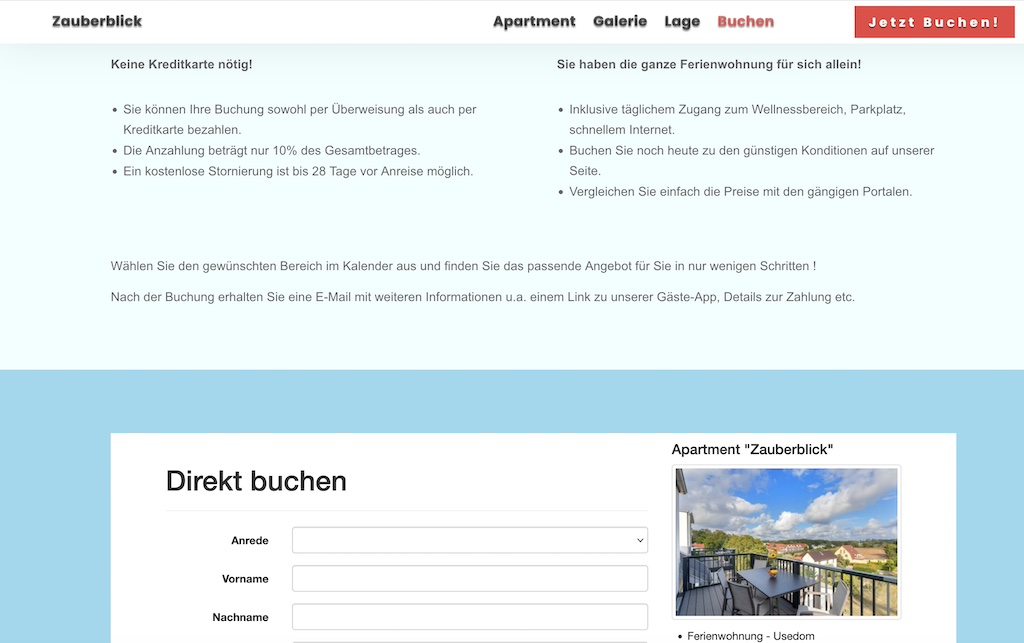 Wir gestalten zusammen mit Ihnen die Website. Wir nutzen ein professionelles Templatesystem, damit wir Ihr Apartment optimal darstellen können und Kunden auch außerhalb der großen Buchungsplattformen Ihr Apartment im Internet finden können. Sie bringen die Bilder Ihres Apartments mit oder wir organisieren einen Fototermin mit einem professionellen Fotografen.